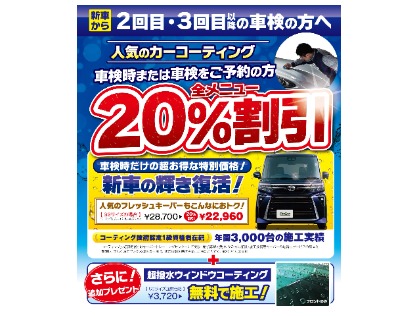 実施金額の2%ポイント貯まる 代車あり(対象メニューは店舗にご確認ください)キーパーコーティング技術1級資格取得者在籍クレジットカード払いOK |