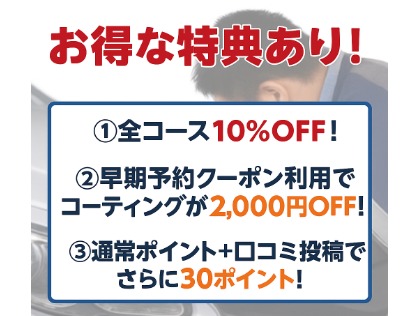 専門指導・訓練を受けたスタッフが丁寧に洗車・コーティングいたします。予約&実施で楽天ポイントが貯まります。事前予約で待ち時間なし。