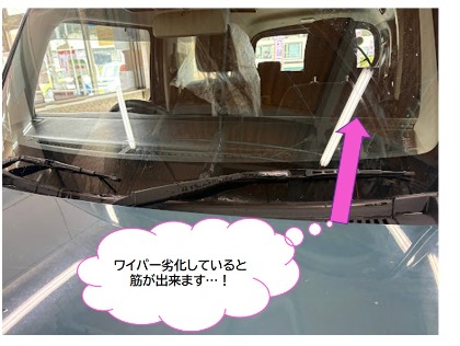 ・筋が残る(拭きムラ)(筋が出来る): ガラスに水滴や油膜が残り、夜間や対向車のライトで視界が大きく妨げられます。
