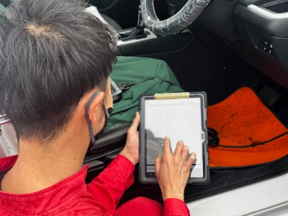 車のコンピューターをチェックして、隠れた異常を見つけます。 排ガス対策にもつながる、大切な点検です。