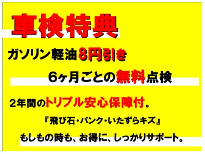 洗車無料!車検後、ガソリンを特別価格でご提供!アフター特典、その他特典あり。