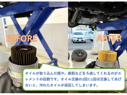 メーカー推奨は1万~1万5千キロとは言われていますが、最近の車は、燃費を重視したエンジン設計になっている車両が多く、0W20 、0W16などの柔らかいオイルが使われています。こういったオイルは、交換を怠ってしまうと粘度が下がってしまいエンジンの中に油膜という保護膜が作れなくなってきます。その状態が続くとエンジンの内部が摩耗して、オイルがガソリンと一緒に燃えてしまいオイル消費しやすくなってしまいます。なので、我々は従来の推奨通りの半年又は5000㎞毎の交換をお勧めさせて頂いております。(オイルエレメントはオイル交換の2回に一回交換してあげてくださいね)