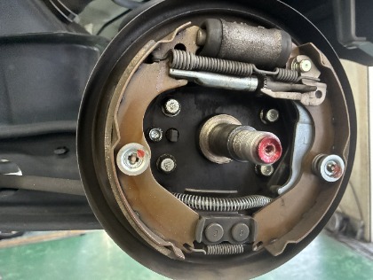 通常はドラムカバーが被っており内部は見ることができませんが、車検時は分解してブレーキの残量やブレーキオイル漏れを確認します。