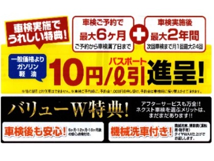 車検後、綺麗に洗車をしてお車をお返しします。車検後も安心の6ヶ月毎の無料安全点検付。ガソリン・軽油割引券進呈!!