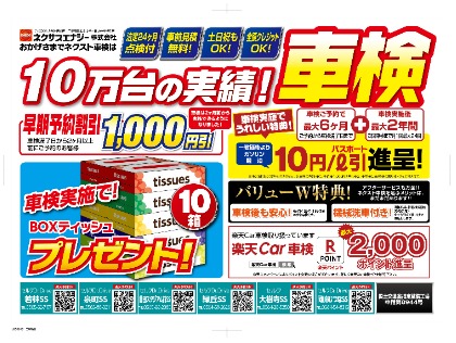 国土交通省認証整備工場で実施する法定24ヶ月点検付車検です。車検の金額も事前見積りで金額決定。お客様がご納得したお車の整備を実施しますので追加費用の心配もいりません。車検後はお車を綺麗に洗車してお返しします。車検も一日で完了し、土曜・日曜日も実施可能です。車検後も安心の6ヶ月毎の無料安全点検付です。半年前からの予約受付をしており予約または車検実施でガソリン・軽油割引券進呈!!お得に給油出来ます!!