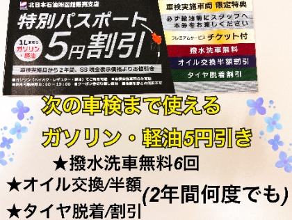 ①次回の車検までガソリン・軽油が店頭価格から5円引き、お得にメンテナンスできるクーポン券を進呈②撥水洗車・室内清掃サービス③BOXティッシュ20箱プレゼント!!