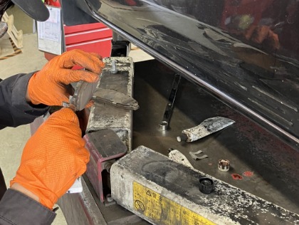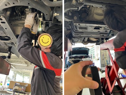 ファンベルとの交換に、ブレーキ周りのメンテナンス。下回りも隅々まで点検します。