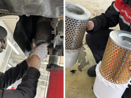エアクリーナー交換です。右側が新品部品、左側が経年劣化により汚れていることが良く分かります。
