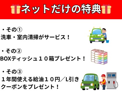 洗車・室内清掃無料。車検実施でティッシュ10箱プレゼント・1年間使えるガソリン10円/L引きクーポンプレゼント!
